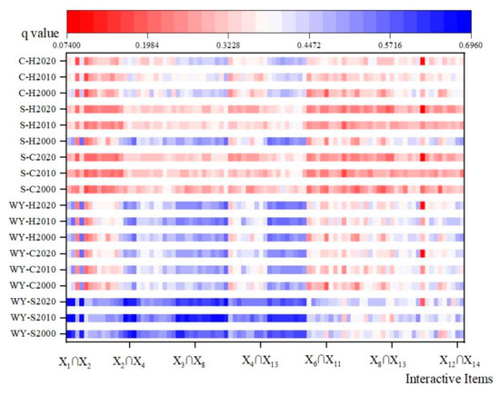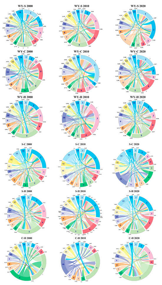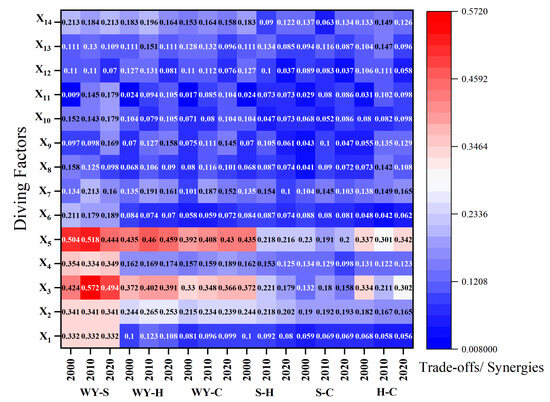 Overall, natural driving factors (i.e., X1–X6) were the most significant for the ESTSs, and the highest contributions occurred in the WY-S of ESTSs. The influence of natural factors on WY-S is particularly obvious, as derived from Figure 6. Among the natural driving factors, NDVI (X5) had the strongest impact on ESTSs. The NDVI also had the greatest impact on the enhancement of ESTSs, indicating that WY-S, WY-H, WY-C, S-H, S-C, and H-C continue to increase as with the increase in the NDVI. Following NDVI, the other natural factors (the average annual precipitation X4, slope X2, and temperature X3) were also important. The impacts of ecological conversion area (X14), urbanization rate (X7), and elevation (X1) were relatively smaller, reaching about 0.13, while the impacts of the rest of the factors, including rural per capita income (X13), social investment in fixed assets grain production (X9), grain production (X10), GDP (X8), urban per capita income (X12), population (X6), and the proportion of industrial and service industries (X11), were the lowest, accounting for about 0.10. In addition, the explanatory power of the natural driving factors (X1–X5) on the ESTSs remained stable during 2000–2020, and the explanatory power of the socio-economic factors (X6–X13) and the regional policy factors (X14) on the ESTSs showed an upward and downward trend, respectively.