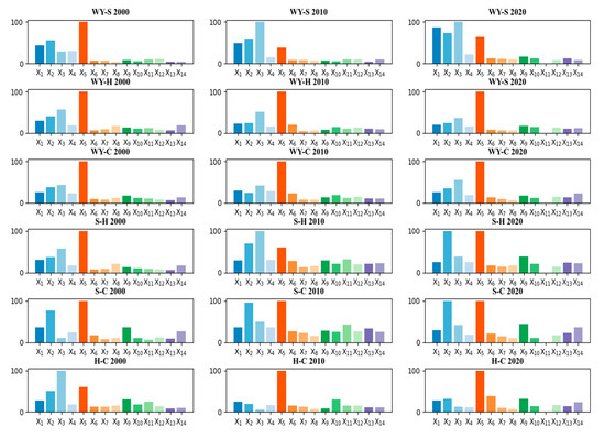 The contributions of the driving factors to ESTSs during 2000–2020 are posted in Figure 7, and the average explanatory power for each factor was obtained by averaging its contribution ratios in all six ESTSs across three years. Finally, the factors were ranked in terms of their explanatory abilities, as follows: X5 (0.362) > X4 (0.322) > X2 (0.235) > X3 (0.179) > X14 (0.154) > X7 (0.146) > X1 (0.125) > X13 (0.114) > X9 (0.100) > X10 (0.095) > X8 (0.094) > X12 (0.093) > X6 (0.091) > X11 (0.075).