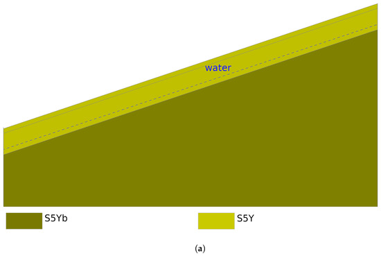 A more complex model is used for the case of root reinforcement. Here, the third layer of a constant thickness of 0.9 m is added to the surface (see Figure 3b and Table 1). The used soil parameters in it are also higher than in the original soil, this time due to root reinforcement. The specific values of increase are derived from the literature [34,35,37].