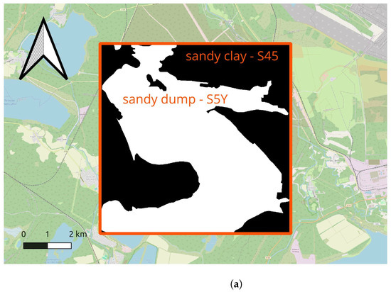 For this study, the area of the soil dump of the former open-cast mine Lohsa II in Lusatia, Germany, see Figure 1, was chosen. The map presented below was obtained from [40]. The area is interesting because several landslides have appeared there in recent times. Specifically, the slopes of the mining waste dump Scheibe at the northwest border of the closed coal mine Lohsa II moved in the spring of 2019. Even later (in the spring of 2021), landslides appeared on the slopes near the lake Knappensee.