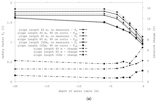 It is typical for the particular two- or three-layer model with parallel construction described above that the type and shape of the slip surface changes as the least favorable slip surface lengthens. Short slip surfaces with the lowest are typically circular in shape (B—Bishop) confined in the uppermost layer, or in the central and rooted layer, not extending into the lowest firmer layer with an interface 5 m below the surface (Figure 4a). The intermediate slip surfaces are most commonly polygonal (S—Sarma) following the top of the interface at 5 m depth. In terms of type, they most closely resemble the infinite slope model (Figure 4b). In some cases, usually with the groundwater level between depths of 3 and 6 m below ground level, long slip surfaces of circular shape cross the aforementioned interface at a depth of 5 m below the surface and extend deep into the firmer layer (BD—Bishop, deep)—Figure 4c.