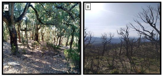 The Bouzizi forest (36°53′59.7″ N–7°39’10.2″ E) is located in Algeria, southeast of the Edough Massif, between 800 and 850 m above sea level. This locality is characterized by cork oak (Quercus suber L.) forests and its rich associated floristic procession. The post-fire forest of Aïn Barbar is located near the road (36°55′03.8″ N–7°36′43.0″ E). The area burnt down totally in August 2021. The locality was characterized by the dominance of the cork oak and by the presence of some specimens of the zean oak (Quercus canariensis) and maritime pine (Pinus pinaster), located at an altitude of 579 m above the Mediterranean Sea (Figure 2).