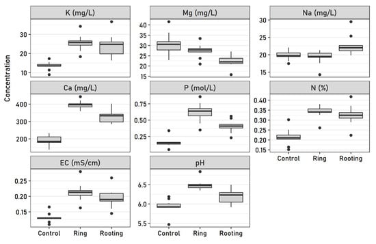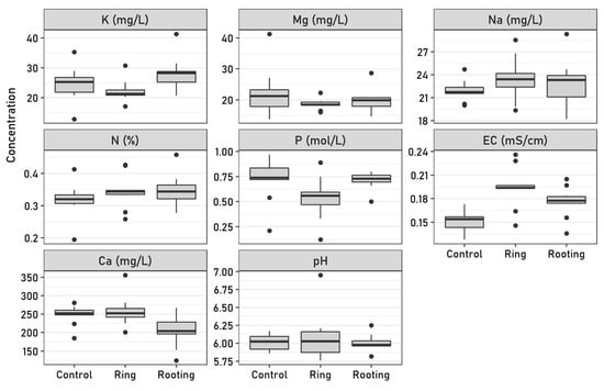 The calcium content was the lowest in the core part of the rooting, while it was nearly similar in samples collected from the redistributed soil (ring) and the control (Figure 4). Additionally, the electrical conductivity was the lowest in samples free from wild boar disturbance (control) and higher in the rooting and the ring, with extremes at both ends of their ranges (Figure 4).