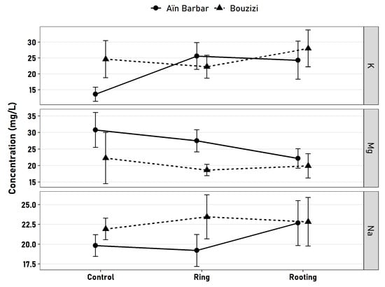 On the other hand, significant interactions of the site and rooting indicate that wild boar rootings could have various effects on soil properties depending on the presence/absence of fire disturbance. In the case of potassium, its concentration was different between sites without rooting (control: Bouzizi = 24.6 ± 5.8 vs. Aïn Barbar = 13.6 ± 2.2 mg/L), but wild boar rooting induced the convergence of these tendencies (Figure 6). In contrast, sodium levels were the most different in the redistributed soil (ring) between the natural environment and the post-fire site (ring: Bouzizi = 23.5 ± 2.8 vs. Aïn Barbar = 19.2 ± 2 mg/L), and its levels were more similar even in the rooting or in the control samples.