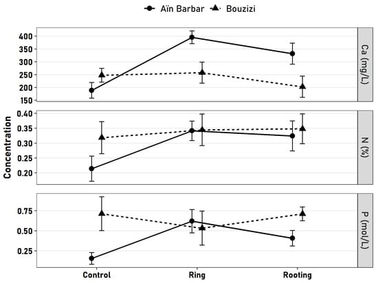 Interaction plots of rooting and site effects on calcium, total nitrogen, and phosphorus content of the soil. The solid line with black points indicates data collected from Aïn Barbar, the dotted line with black triangles indicates data collected from Bouzizi.