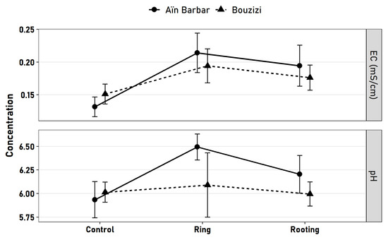 Electrical conductivity values were similar between sites; only rooting affected them significantly (Table 4). The variability was not impressive considering the pH of the samples, but still reached a significant difference between sites and among rootings, where the differences were the highest in the redistributed soil (ring: Bouzizi = 6.1 ± 0.3 vs. Aïn Barbar = 6.5 ± 0.1) (Figure 8).