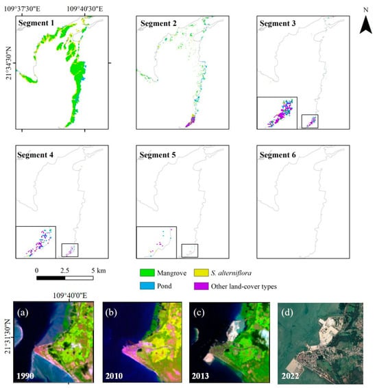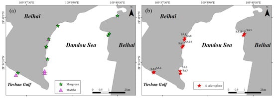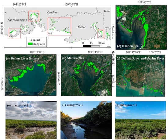 - Shen, H.; Zhao, B.; Chen, M.; Huang, R.; Yu, K.; Liang, W. Changes of the area of Spartina alterniflora and mangroves in Guangxi Shankou Mangrove National Nature Reserve from 1995 to 2019. Chin. J. Appl. Ecol. 2022, 33, 397–404. [Google Scholar] [CrossRef]