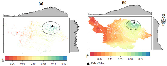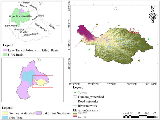 This study was conducted in the Gumara watershed, which is a subwatershed of the Lake Tana subbasin in the Upper Blue Nile Basin (UBNB) of Ethiopia (Figure 1a,b). The watershed boundary lies between 11°35′ N–11°55′ north latitude and 37°30′ E–38°15′ east longitude (Figure 1c). The main river of the watershed is the Gumara River, which originates from the Guna Mountains and drains into Lake Tana. The total drainage area of the watershed delineated using the 30 m × 30 m digital elevation model (DEM) is approximately 1425 square kilometers (km2) (Figure 1c). The elevation of the watershed generally ranges between 1782 and 3712 m above mean sea level (amsl) (Figure 1c). The watershed is characterized by a mountainous terrain with a steep gradient in the upstream part and an undulating terrain with a gentle gradient in the downstream part of the watershed [41]. Climatologically, the watershed experiences a long rainy season from June to September, with an average annual areal rainfall of 1445 mm. The average annual temperature of the watershed is approximately 20.5 °C. The lowland part of the watershed is prone to flooding in the wet season (June to September), and it also deposits eroded soil from upland subwatersheds [47]. In the watershed, cultivated land is the major LULC class and accounts for more than 75% of the watershed area; the remaining watershed area is covered with grassland, shrublands, forests, and settlements [32]. The lower part of the watershed adjacent to Lake Tana is known for rice cultivation [43]. In watersheds, rapid transitions of grassland, shrubland, and forest to cropland have been observed in recent decades. The majority of the watershed is dominated by rural kebeles with scattered settlement and their livelihood is based on mixed farming system by growing crops (teff, rice, wheat, barely, maize beans, oats, potato, etc.) and raising of livestock (goat, sheep, cattle, hen, etc.) [41]. In addition, watersheds have the potential for growth in different sectors, such as agroindustry, ecotourism, agroforestry, livestock, and energy [48]. The watershed under study was selected because it is prone to soil erosion and flooding as a result of intensive agricultural cultivation, as shown in previous studies [49,50].