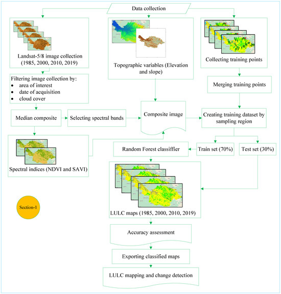 This study mainly comprises two main sections: (1) LULC classification and change detection and (2) future LULC prediction. The first section was mainly focused on LULC classification for the years 1985, 2000, 2010, and 2019 and change detection (1985–2000, 2000–2010, 2010–2019, and 1985–2019), as presented in Figure 3. In this section, satellite image collection (Landsat-5/8), filtering image collection (by area of interest, date of acquisition, and metadata), computation of the median composite of filtered image collection, preparation of input variables (vegetation indices and topographic variables), collection and merging of training points, sampling region by integrating the median composite and merged training points, classification using the RF algorithm, accuracy assessment, and exporting of classified images were performed in the GEE environment. As GEE is a petabyte cloud-based platform, it makes image processing and classification easier without downloading the input satellite images [12]. Mapping of exported LULC images and change detection were performed using ARC-GIS 10.4. In this study, a change detection starting year (1985) was selected since substantial land use change was observed in most parts of Ethiopia during this year following the land reform proclamation of 1975 [35,53].