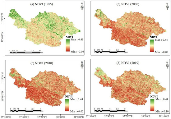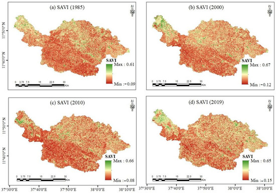 The spectral bands SR_B1 to SR_B5 and SR-B7 for Landsat-5/TM and SR_B2 to SR_B7 for Landsat-8/OLI were used as the input variables for the RF classifier. In addition to the spectral bands, vegetation indices and topographic factors (elevation and slope) were used to improve the classification accuracy. For the vegetation indices, the normalized difference vegetation index (NDVI) and soil adjusted vegetation index (SAVI) were used for this study. The NDVI is the most widely used indicator of vegetation greenness [57]. The NDVI values ranged from −1 to 1; low NDVI values (less than or equal to 0.1) corresponded to areas of bare land, rock, water, sand, or snow; moderate NDVI values (0.2 to 0.5) corresponded to sparse vegetation cover; and high NDVI values (greater than or equal to 0.6) corresponded to dense vegetation cover. The SAVI is a modified version of the NDVI that considers the effect of soil reflectance [58]. In the SAVI expression (Equation (1)), L takes different values depending on vegetation cover, where L = 1 in areas with no green vegetation cover, L = 0.5 in areas with moderate green vegetation cover, and L = 0 in areas with very high vegetation cover (which is equivalent to the NDVI equation). For this study, L = 0.5 was used considering the vegetation cover of the study watershed. Here, all the indices were computed in the GEE environment using the final median composite of the Landsat-5/8 images by applying Equations (1) and (2). Figure 5 and Figure 6 show the computed spectral indices of the Gumara watershed for 1985, 2000, 2010, and 2019.