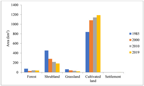 LULC change detection analysis is important for determining the amount and type of land use changes that occurred over certain study periods. Among several change detection approaches, post classification change detection (PCCD), or map-to-map comparison approaches were employed for this study. This approach is most widely applied for comparing classified maps of different years [62,63]. In this study, for each of the LULC class percentage changes and rates of change for the four periods of 1985–2000, 2000–2010, 2010–2019, and 1985–2019 were computed to detect LULC changes in the study watershed using Equations (7) and (8).