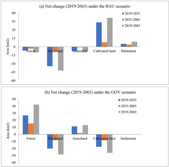 Table 10. (a) Gains and losses of LULC classes between 2019 and 2065 under the BAU scenario. (b) Gains and losses of LULC classes between 2019 and 2065 under the GOV scenario.
