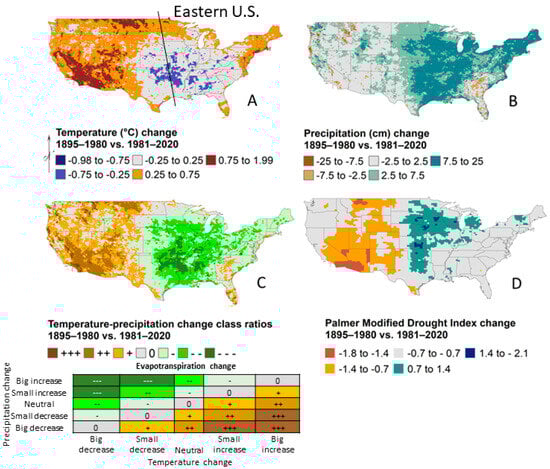 Figure 1. Changes in the mean annual temperature (A), precipitation (B), temperature-precipitation change class ratios (C), and Palmer Modified Drought Index (D) between 1895–1980 and 1981–2020 for the United States. The temperature-precipitation change class ratios were calculated by applying a simple classification to mean temperature and precipitation maps but presented similar changes of stable or decreased evapotranspiration in the eastern U.S. as the Palmer Modified Drought Index, which applied tree-ring reconstructions of available water and instrumental data. Data are modified [4,8].