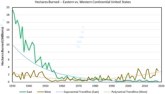 Figure 2. Area (hectares) burned and trendlines by region based on fire records provided by the USDA Forest Service, Washington Office, and Short [30]. The eastern region is composed of Minnesota, Iowa, Missouri, Arkansas, and Louisiana and all states eastward. The western region is composed of all states west of the eastern region states. In 1930, ten-fold more hectares burned in the east than the west based on long-term USDA Forest Service fire records (19 million vs. 1.9 million hectares, respectively; Figure 2). Some of this difference might be due to underreporting in the west associated with lower human population densities, hence fewer fire detections due to remoteness. At any rate, annual hectares burned held steady in the west until a noticeable drop occurred around 1950. In contrast, annual hectares burned by wildfire dropped sharply in the east until the mid-1950s, with slow decreases thereafter. The east and the west had similar total area burned by wildfire during the 1960s to the early 1980s, after which trendlines crossed, with the west surpassing the east in the extent of burning by wildfires. This upward trend separates two regions into the future, as the west is currently burning by wildfires at a similar rate as during the 1930s.