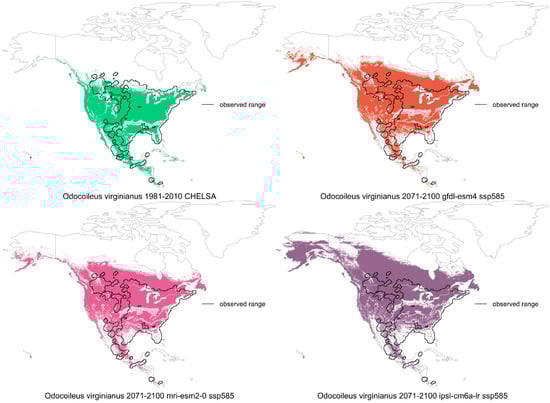 Figure 3. Modeled species distributions of white-tailed deer that show observed range (outlined) from occurrence records, the climate envelope (temperature and precipitation of occurrences) during 1981–2010 (green), and the likely future climate envelopes during 2071–2100, under three general circulation models and high emissions (non-green colors; modeling followed [107]).