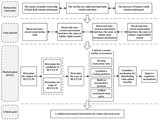 - Value pursuit. The RCCCLM policy was originally made to reverse the separate urban–rural construction land market and promote the trading of rural construction land and state-owned construction land in a unified market. Therefore, in implementing the RCCCLM policy, its value targets were set compared with state-owned construction land regarding four aspects: similar land, similar rights, similar price and similar responsibility. “Similar land” means that rural collectively owned commercial construction land should have the same or similar utilization methods as state-owned construction land. “Similar rights” means that rural collectively owned commercial construction land should have the same or similar rights as state-owned construction land, such as the right to disposition and the right to profit. “Similar price” means that RCCCLM requires the establishment of the same or similar price formation mechanism as the transaction of state-owned construction land. However, due to the difference in location, ownership and other factors of urban and rural construction land, it is inevitable that there will be a difference in the market price of urban and rural construction land. “Similar responsibility” means that in the process of RCCCLM, the entities involved need to bear corresponding responsibilities. For example, local governments need to assume responsibility for infrastructure construction and contract supervision of land plots for marketization.