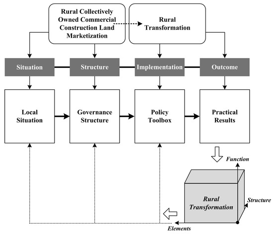 The core issue of this study was to analyze the path and mechanism of the impact of RCCCLM on rural transformation. In our fieldwork, we found that there are differences in the implementation of the RCCCLM policy in different regions. Some studies attribute the differences in the performance of the same policy in different regions to the differences in “Place” [19]. This reminds us of the need to start from a “Place” perspective when formulating research questions. Therefore, we took the local situation as the starting point of the whole study, and we also paid attention to the influence of the governance structure and policy toolbox on the outcome of policy implementation. Therefore, we innovatively built a theoretical framework with the core chain of “Situation-Structure-Implementation-Outcome” to analyze the core issues of this study.