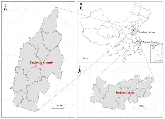 In implementing RCCCLM, there are distinct differences in the policy practice logic of different places, which can be attributed to local development goals, economic characteristics, collective autonomy capacity and resource endowment [21]. For example, in the Yangtze River Delta region, during the process of RCCCLM, there was a “legalization” of collectively owned construction land that had previously been implicitly transferred with the help of the marketization policy. In the central and western regions of China, the motivation for RCCCLM is significantly weaker than that in the eastern region. Therefore, this study selected the representatives of Yucheng county in Shandong Province and Deqing county in Zhejiang Province, aiming to comprehend the impact of RCCCLM on rural transformation based on differentiated local situations. Please see Figure 2.