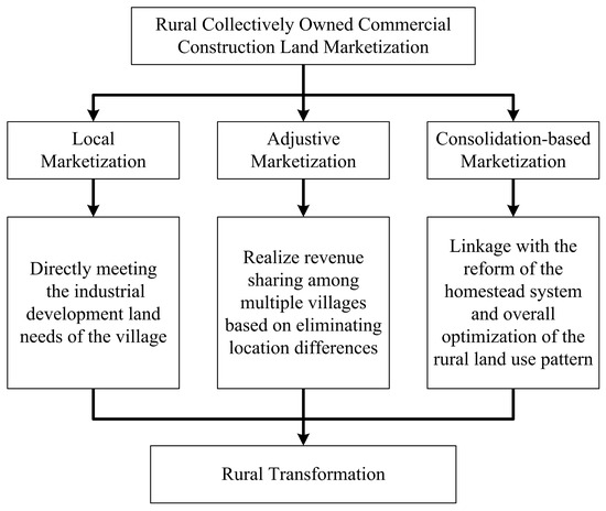 As a major land category in the rural land use structure, construction land plays a vital role in supporting rural economic development. The supply mode and governance mode of rural construction land, especially rural industrial land, relate directly to rural revitalization. China has long been committed to breaking through the institutional barriers of the marketization of rural construction land to re-utilize idle and inefficient construction land in rural areas, thus boosting rural revitalization. Before 2020, rural collectively owned commercial construction land marketization (RCCCLM) met with a number of legal obstacles, which suppressed the demand for industrial land in rural areas for a long time, and seriously hindered the development of rural economy. In some developed areas, rural collectively owned commercial construction land (RCCCL) often has access to the land market in the form of “murky dealing”, which often leads to social problems such as the loss of rural land assets and small property rights housing. In 2020, after a long period of small-scale RCCCLM pilots, the revised Land Administration Law of the People’s Republic of China began to allow RCCCLM under the premise of complying with the planning and use control. The legal permission of RCCCLM not only fundamentally removes the legal obstacle that rural collectively owned commercial construction land cannot go to the land market, but also makes great changes in the external policy environment and development of opportunities for rural development. Some scholars believe that RCCCLM will provide the necessary land space for the development of rural industries, which contributes to rural industrial revitalization in China [8,9,10]. Some have proposed that RCCCLM can also increase farmers’ income, so that they can obtain property gains through shareholding and dividends [11,12,13]. Therefore, the legal permission of RCCCLM meets the actual development needs of rural areas and provides broad implications for academic exchanges on how RCCCLM can promote rural transformation. Despite these aforementioned studies, research where the path and mode of how RCCCLM can promote rural transformation is still limited. In particular, the influencing mechanism of RCCCLM on rural transformation needs to be figured out in theory and in practice. Therefore, this study attempted to provide the required analysis to fill that gap by addressing the research question “What are the core pathways and key mechanisms by which RCCCLM affects rural transformation?”