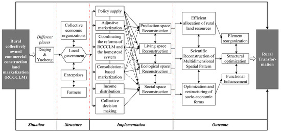 The innovation of the rural industrial land supply mode directly affects the revitalization of rural industry, thereby affecting rural transformation. The implementation of the RCCCLM policy has realized the institutional innovation of the guarantee of rural industrial land. Based on two typical cases in Yucheng, Shandong Province, and Deqing, Zhejiang Province, we pioneered an analysis framework of “Situation-Structure-Implementation-Outcome” and analyzed the impact path and key mechanism of RCCCLM on rural transformation. Our analytical framework emphasizes “Place” as the starting point of analysis, which is different from traditional policy analysis frameworks. This analytical framework prompted this study to focus on the differences in the practice of RCCCLM. Our findings show the following. (1) The paths of RCCCLM on rural transformation mainly include local marketization, adjustive marketization and consolidation-based marketization. (2) The impact mechanism of RCCCLM on rural transformation mainly covers empowerment, the restructuring of the rural “production-living-ecological-social” space and the transformation of farmers’ livelihoods and improvement in rural governance capacity. (3) In the process of implementing the RCCCLM policy, it is necessary to coordinate policy tools such as the reform of the homestead system and tying increases and decreases in urban and rural construction land, and combine land consolidation projects in order to realize the reconstruction of rural land spatial structures and rural function improvements.