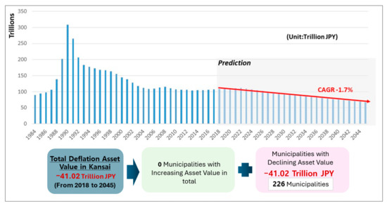 When comparing the average income in each area, Tokyo city holds the highest at 6575 thousand JPY [64]. The income multiplier was 3.82 in Tokyo city, while in Osaka, Kyoto, and Kobe city, it was 1.98, 3.05, and 2.53, respectively. This indicates the leverage to purchase a house by household. The Kansai metropolitan area appears to have a lighter burden when it comes to buying homes in comparison to the Tokyo metropolitan area. In Tokyo city, the HAV will decline −18.8% by 2045 against −10.5% in Kansai. The impact of HAV deflation would thus be a more severe problem, especially for Tokyo city, which presently holds higher housing values.