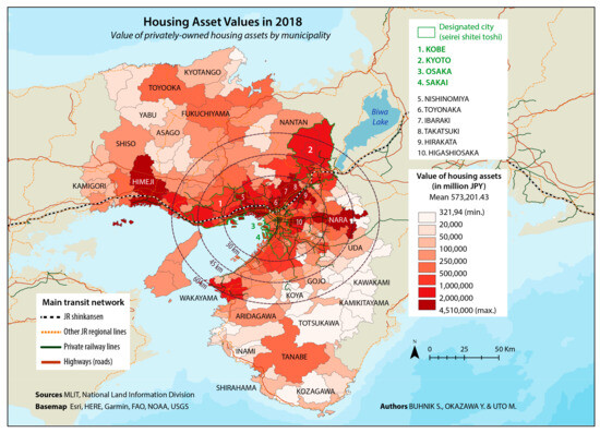 Total housing asset values by municipality (2018). Note: Range rings are centered on the CBD district of Honmachi, between Umeda and Namba, in Osaka City.