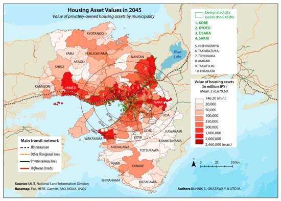 A mapping of total housing asset values on a municipal scale in 2018 and 2045 reveals an unequal distribution of wealth in favor of the region’s main poles (Kyoto, Osaka, Kobe, Nara, Wakayama, and Himeji) and their surrounding suburbs, and this hierarchy is lasting (Figure 4 and Figure 5).