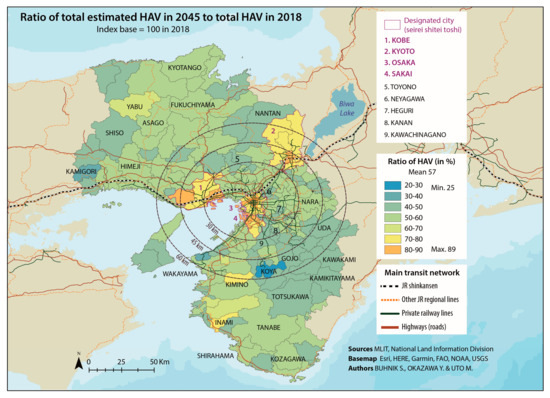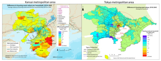 Considering the results we mapped, we can provide some hints to the two questions raised at the beginning of Section 3. We first asked whether depopulation and decrease in HAVs are distributed in similar patterns or not in Tier 2 (Kansai) and Tier 1 (Tokyo) metropolises; second, we wondered whether the effects of HAV deflation would be more severe in Tier 2 rather than Tier 1 (Tokyo) metropolises.