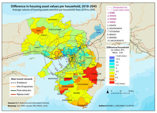 Finally, the financial implications, both in collective and individual terms, are addressed with Figure 7. Because they presently hold some of the most valued residential markets of the region but face stronger rates of aging and depopulation than regional cores, the municipalities along the backbone of the Kansai metropolitan area (like Nishinomiya, Takarazuka, Takatsuki) may face the greatest HAV deflation, as measured by the sum of the difference in JPY/m2 between 2018 and 2045. Such municipalities have grown as bedroom communities for mainly more than upper middle-income households; thus, the residential land price is now relatively high compared with other residential areas. If we consider the difference per household, an average loss of 7.5 to 13 million JPY (around 53,000 to 91,000 USD) per household could be expected.