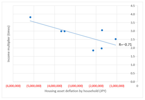 To examine the relationship between income multipliers and HAV declines, the results in Table 5 are plotted on the scatter plot of Figure 9. The correlation coefficient between HAV decline per household and income multiplier is −0.71, which shows a relatively strong negative correlation. This suggests that cities with higher income multipliers tend to have higher HAV declines per household. Cities with housing prices that are relatively high for the city’s income level will experience greater housing asset deflation. This is consistent with the finding that bedroom communities experience greater housing asset deflation. If it were not for commuters to the CBD, bedroom communities would have had lower housing prices. As the city expanded, housing prices skyrocketed despite overly long commuting time. But as the population continuously declines, housing closer to the CBDs becomes more affordable, so that the relevance of bedroom communities comes to an end.