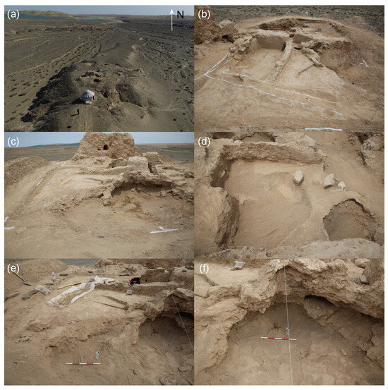 Details of SDNBT site: (a) SDNBT site before excavation. (b) SDNBT site after excavation. (c,d) Dwelling remains at SDNBT site. (e,f) Archaeological remains from dwelling remains.