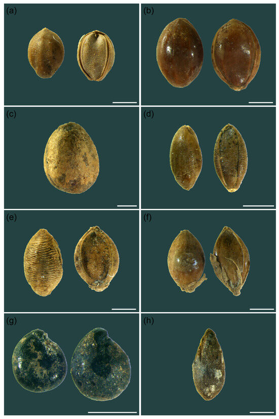 Identified plant seeds from the SDNBT site (scale bar: 1 mm): (a) Setaria italica; (b) Panicum miliaceum; (c) Cannabis sativa L.; (d) Setaria viridis; (e) Setaria pumila; (f) Echinochloa crusgalli; (g) Atriplex patens; (h) Erodium stephanianum Willd.