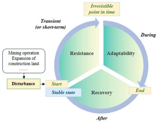 As a hot research topic, the complex connotations of resilience have not been consistently finalized. For example, Macgillivray and Grime [16] believed that there may be a trade-off between resilience and resistance; Hodgson et al. [17] proposed that concepts of resistance and recovery can complement each other. Previous research [10,11] has illustrated that multiple processes influence resilience evaluation and that a single indicator cannot simply be used to measure resilience. This implies that it is necessary to establish appropriate evaluation frameworks based on different research objects. In 2019, Grafton et al. [18] proposed that social–ecological systems can be measured using the “3R model”, which refines the dynamic process of resilience and has been initially explored in empirical case studies [19]. They explored resistance, recovery, and robustness as three important attributes of socio-ecological system resilience, and such definitions provide scientific and practical guidance on how different systems can achieve resilience. However, for energy development zones, which are vulnerable to human activities, the situation is somewhat different. It is crucial to focus on the adaptability of the ecosystems to disturbances [20] during ongoing activities like mining operations. Thus, this paper considers adding an “adaptability” index to modify the existing “3R” conceptual model to explore whether ecosystems can positively adapt to external disturbance by adjusting their internal processes when the disturbance continues to occur. In summary, this paper argues that the ecological resilience of energy development zones can be viewed as the ability of regional ecosystems to respond at different stages of disturbance. Ecological resilience is discussed comprehensively from three aspects: the resistance of the ecosystem in the transient or short-term period when the disturbance occurs, the adaptability during the continuation of the disturbance, and the recovery after the disturbance ends. These three are interconnected and indispensable and work together for ecological resilience, although their focus varies at different periods when disturbance occurs.