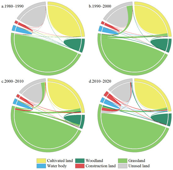 (a–d): Chord diagram of land-use transfer in the SEZ from 1980 to 2020. (The chord diagram is utilized to depict the correlation between multiple land-use types. The line segment that connects two points on a circle is referred to as a chord. Each chord represents the transformation between two land-use types, and the thickness of the chord represents the size of the transferred area.)