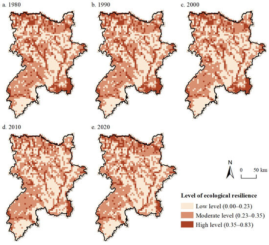 (a–e): Spatial and temporal changes in the ecological resilience level in the SEZ from 1980 to 2020.