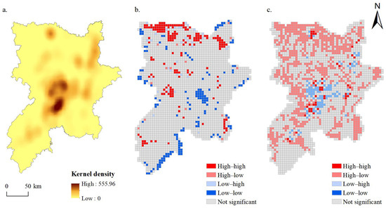 Spatial relationship between ecological resilience and energy development in the SEZ in 2020. ((a) Kernel density map of energy development enterprises; (b) local spatial autocorrelation map of ecological resilience level; (c) local spatial autocorrelation map of ecological resilience level—energy development enterprises).