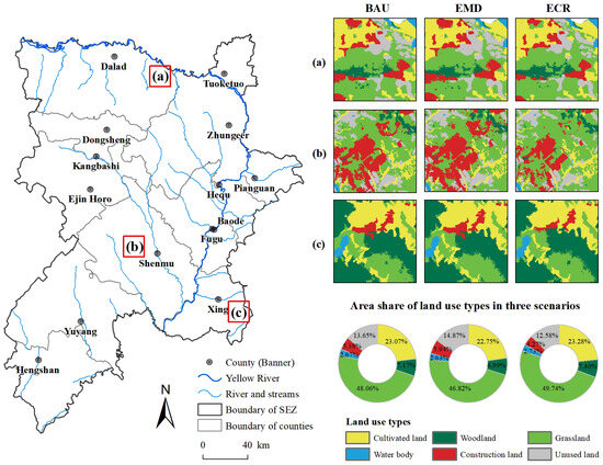 Because the SEZ is extensive, the land-use distribution map of the entire area cannot effectively illustrate the differences in land use in various scenarios. Therefore, selected areas within the three localities, along the Yellow River in the northern part of the SEZ, the downtown area of Shenmu City, and the woodlands of Xingxian County, are highlighted to provide detailed insights (Figure 6).