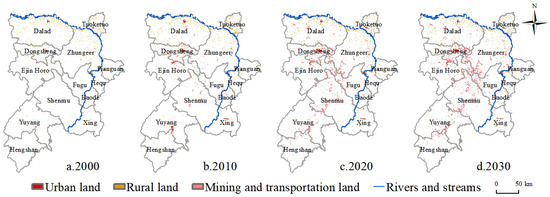 Since the 21st century, China’s diversified development has brought about dramatic shifts, including changes in the spatial patterns of construction land expansion [53]. As is shown in Figure 8, from 2000 to 2010, the construction land in the SEZ was characterized by a dominance of rural land, primarily concentrated along the Yellow River in the northern areas. Meanwhile, during this period, there was a significant increase in urban land, amounting to 10,476.21 hm2, which was clustered in the urban centers of Dalad Banner, Dongsheng District, and Yuyang District. This shift indicates that the acceleration of urbanization in the SEZ has led to the expansion of urban land. In 2020, the most notable feature was the rapid growth of mining and transportation land use, which became the dominant construction land in the region. Mining and transportation land was mainly concentrated in the central part of the SEZ, as well as in Dongsheng District and Shenmu City. Both of these areas are important coal resource bases in China, and energy development activities drive the rapid expansion of mining and transportation land use. According to the simulated 2030 BAU scenario, the expansion of mining and transportation land will continue and dominate the regional construction land in the Coal Resource Zone. In addition, as can be seen in Figure 9, the overall area of construction land in the SEZ grows rapidly between 2000 and 2030; however, this growth is accompanied by a rapid decline in cultivated land and ecological land (woodland, grassland, water body, and unused land), which will pose a significant threat to the ecological resilience of the region.