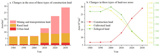 Evolution of different types of land use between 1980 and 2030. ((a) Changes in the area of mining and transportation land, rural land, and urban land; (b) Trends in the area of construction land, cultivated land, and ecological land).