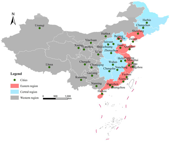 This section will demonstrate the application of the methodologies established in the previous section by referring to 36 major cities in China. These cities are all provincial capital cities or sub-provincial cities in China, which are the political, economic, and cultural centers at the provincial level [28]. The location details of these sample cities can be seen in Figure 2.