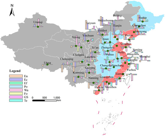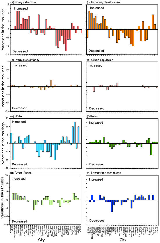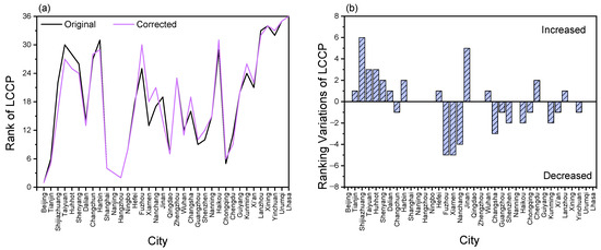 It is interesting to note under the En, Wa, and Fo dimensions, many sample cities obtained higher LCCPV rankings after being corrected. Meanwhile, under the Ef and Po dimensions, 52.8% and 66.7% of sample cities had consistent LCCPV rankings, which were unchanged after correction. However, for the Ec, GS and Te dimensions, the number of cities which obtained higher (16, 14, and 13) and lower (16, 14, and 14) LCCPV rankings were similar. This indicates that there were no obvious trends in the LCCPV ranking variations for these three dimensions.
