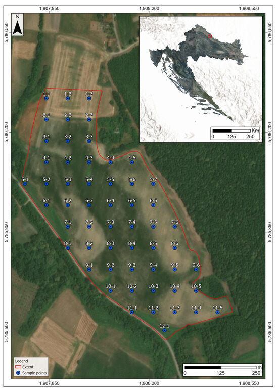 A field investigation was carried out in spring 2022, resulting in acquiring 56 soil samples using Eijkelkamp drill. Precise positions of the sampling locations and the sampling density were determined using a regular square grid (75 × 75 m), created within ArcGIS Pro 3.0 software (Figure 1). ArcGIS Field Maps software, with precision less than 1 m, was used for field data collection. The accuracy achieved was less than 1 m. At each of the sampling points, a soil auger was used to drill 5 holes in a central position and about 1 m in each direction, creating a composite sample, from the 10 to 30 cm soil profile sampled. Since the uppermost 10 cm in agricultural soils are usually in direct contact with chemical pesticides, this area was avoided during sampling. The samples were placed into designated plastic bags and conveyed to the lab. Following this, soil samples underwent air-drying and were sifted through a 2 mm sieve to prepare them for laboratory analysis.
