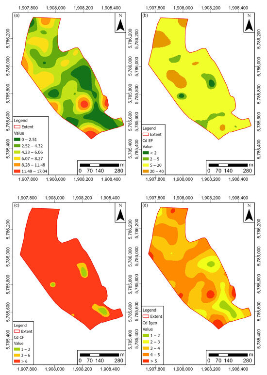 Spatial distribution of (a) cadmium (mg/kg), (b) cadmium enrichment factor, (c) cadmium contamination factor, and (d) cadmium geoaccumulation index in the study area.