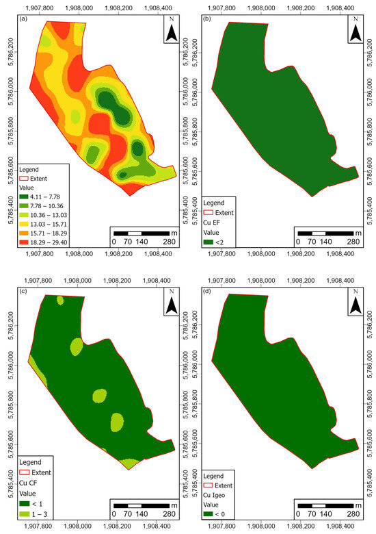 Spatial distribution of (a) copper (mg/kg), (b) copper enrichment factor, (c) copper contamination factor, and (d) copper geoaccumulation index in the study area.