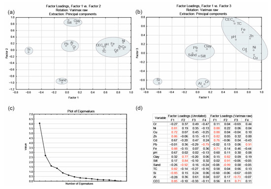Factor analysis resulted in the formation of four factors (F), explaining 77.82% of the total variance (Figure 9d). Based on the inflection point of the eigenvalue diagram (Figure 9c), the first three factors were chosen for the analysis. Figure 9a shows the relationship between rotated F1 and F2 loadings, where five groups of parameters can be seen. The largest group consisted of Cd, Cu, Ni, Zn, Fe, CEC, pH, and TC. The second group consisted of Cr, Pb, and Al; the third group of silt and clay; while Si and sand formed individual groups. The plot diagram of F1 and F3 (Figure 9b) revealed similarities to the F1 vs. F2 diagram, with the only change being that Pb was grouped with clay, silt, and sand, resulting in four groups in total.