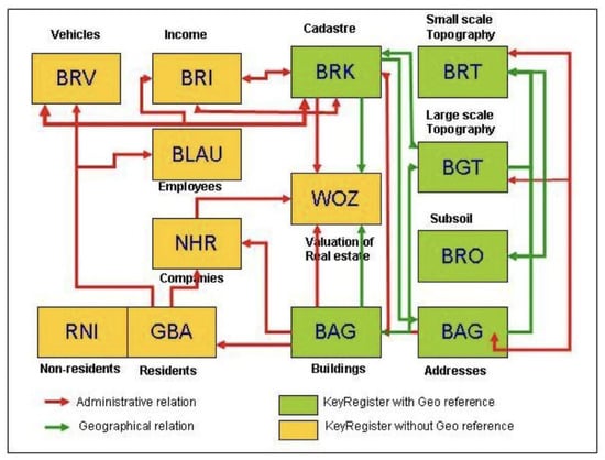 The integration of the land system with other external data sources, such as the judiciary, tax authorities, such as the Kenya Revenue Authority (KRA), registrar of companies and land-buying companies (brokers and investors) [4] is important [10]. This could be similar to the integration of the key registers in the Netherlands [11], as shown in Figure 1. Both geographical and non-geographical (administrative) data are defined to facilitate information exchange, which is important between the government, citizens and businesses [12]. The linkages are determined by the information requirements of one entity to the other; for example, for vehicle registration, a resident’s address is required. However, it could have the functionality to distinguish the different institutions’ tasks and mandates and to align them with each other, all on a conceptual level [7].