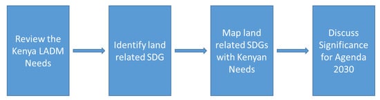 At this stage, the unique Kenyan LADM issues and requirements are identified and reviewed. This will help to identify the SDGs addressing land and land-related issues. The identified SDGs are then mapped to the Kenyan LADM issues identified. The significance of these SDGs to Kenya and the UN Agenda 2030 is discussed. This stage is discussed in Section 6.