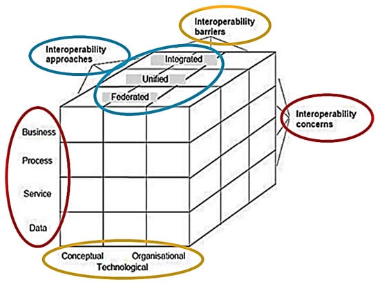 According to Oukes et al. (2023), the ISO Framework for Enterprise Interoperability (FEI) [20] offers a framework for interoperable land administration systems. FEI considers interoperability in three dimensions, as presented in Figure 4: concerns (red), barriers (yellow) and approaches (blue), where each dimension is subdivided into several essential aspects for removing the barriers and concerns to realise cooperation and interoperability.