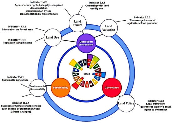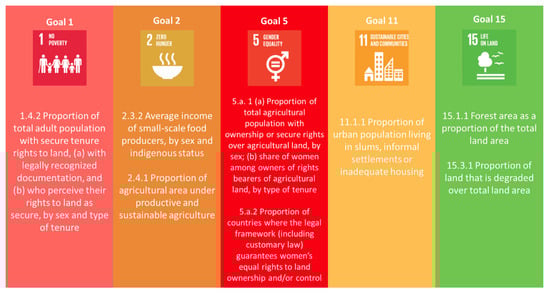 The sustainable development goals (SDGs) were adopted by the United Nations in 2015 as a universal call for action to end poverty, protect the planet and ensure that, by 2030, all people enjoy peace and prosperity [31]. These 17 goals, together with their 169 targets, feature many thematic areas, land management included [6,32]. This being an urgent call, it is expected that all countries [15], developed and developing, action them in a global partnership [33]. As land is an important resource globally, its administration and management are crucial in meeting the sustainable development goals (SDGs), for example, goal 15 and targets 1.4, 2.3, 5.a, 11.1, 15.1 and 15.3 [4,10]. This can be summarised as in Figure 5.