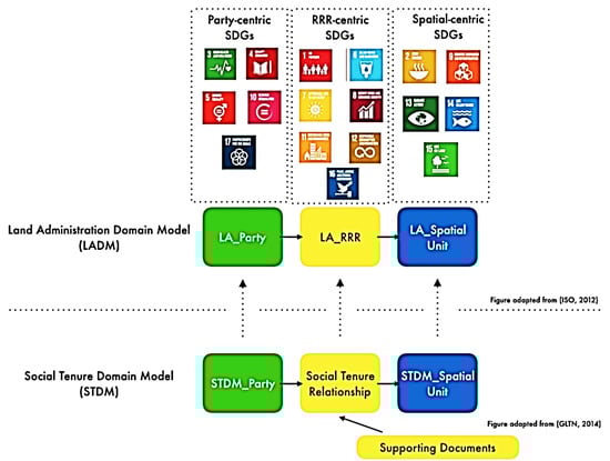 Land is at the center of the SDGs and all goals in one way or the other because a country’s economy, stability, and sustainability depend on its land [34]. A modern and efficient LAS, which contains geospatially precise representations of land parcels and associated RRRs, is essential for countries to achieve the SDGs [35]. Out of the 17 goals, 5 goals do not speak on land explicitly, being goals 4, 8, 10, 16 and 17 [32]. However, if better argued, they could still be pinned to land somehow. An attempt to match the SDGs with basic classes of LADM and to categorise them into party-centric, RRR-centric and spatial-centric SDGs is carried out by Unger et al. (2019), as visualised in Figure 6.